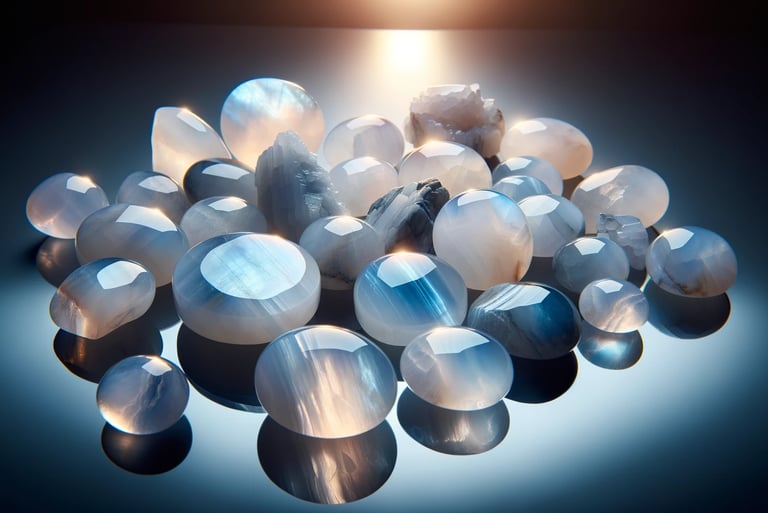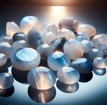 حجر القمر، وهو من الأحجار الكريمة التي تتمتع بجاذبية خاصة ومظهر فريد، يعكس ألواناً متغيرة تشبه ضوء القمر اللطيف. يتميز هذا الحجر بألوانه المتنوعة مثل الأبيض، الأزرق الفاتح، والبيج، مع تأثير بصري متموج يعرف بتأثير "أدولاريسانس".